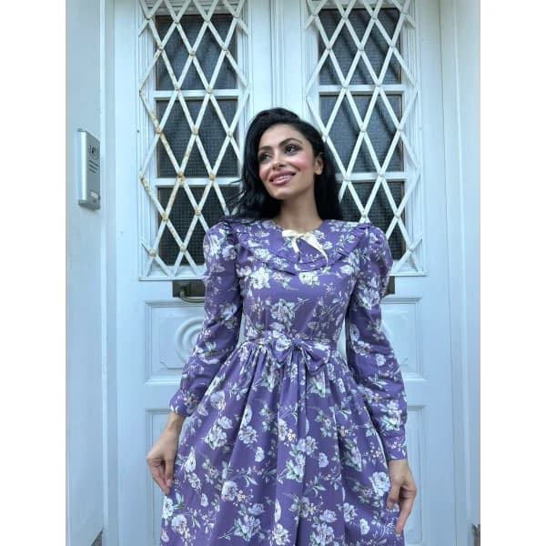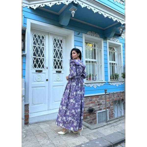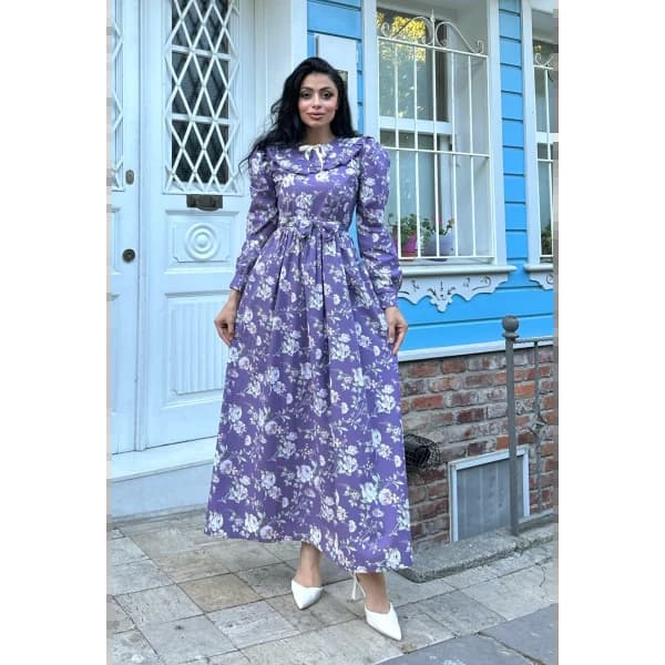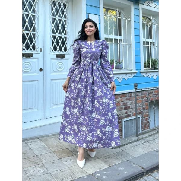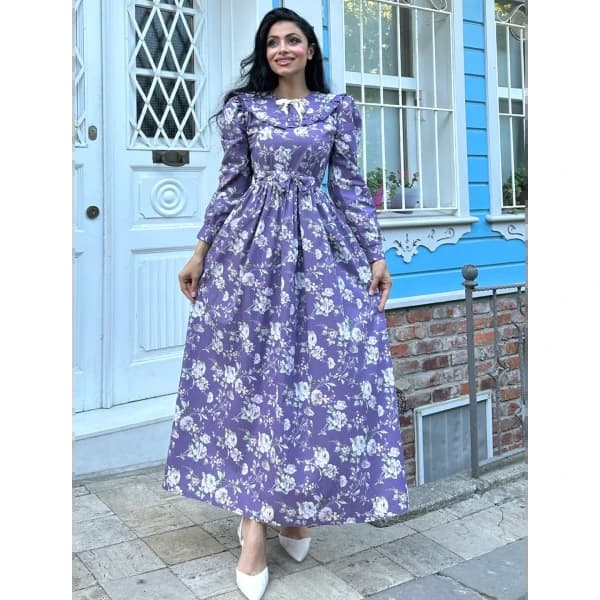 tesettür seyyar yakalı mor poplin kat kat elbise - Coton Kumaş Elbise