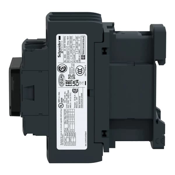TeSys D kontaktör, 3 kutup (3NO), motor kontrol uygulamaları maksimum 25A/690V AC-3/3e (11kW@400V) 220V 50/60Hz AC bobin, 1NO+1NC yerleşik yardımcı kontaklar (NC ayna sertifikalı), vidalı kelepçe terminalleri ile bağlantı sağlar 3600 devir/saat'e kadar çalışma derecesi ve 60°C'ye kadar olan ortamlarda yüksek güvenilirlik ve dayanıklılık sağlar Kompakt (45 mm genişlik), DIN rayına montaj veya vidayla sabitleme Multi standart sertifikalı (IEC, UL, CSA, CCC, EAC, Marine), Green Premium uyumlu (RoHS/REACh).